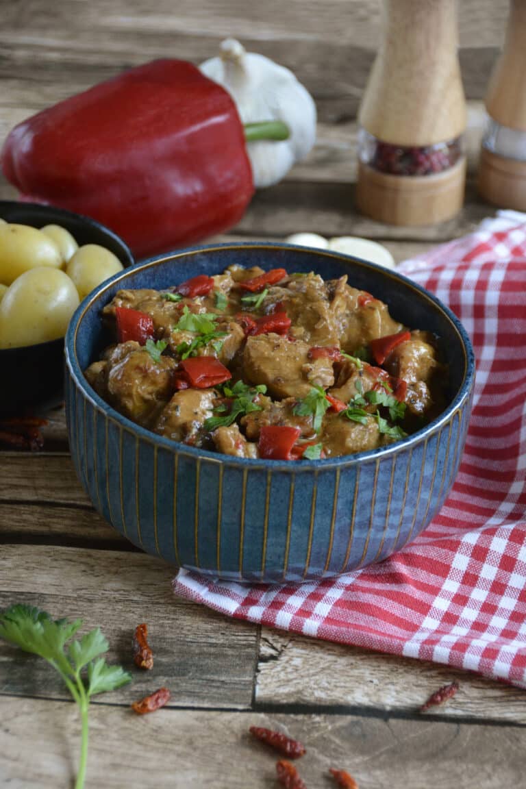 - Ajouter le sauté de veau mouillé avec le vin blanc, assaisonner avec le piment d’Espelette et le bouquet garni. Bien mélanger l’ensemble et laisser réduire à découvert pendant environ 20 min.